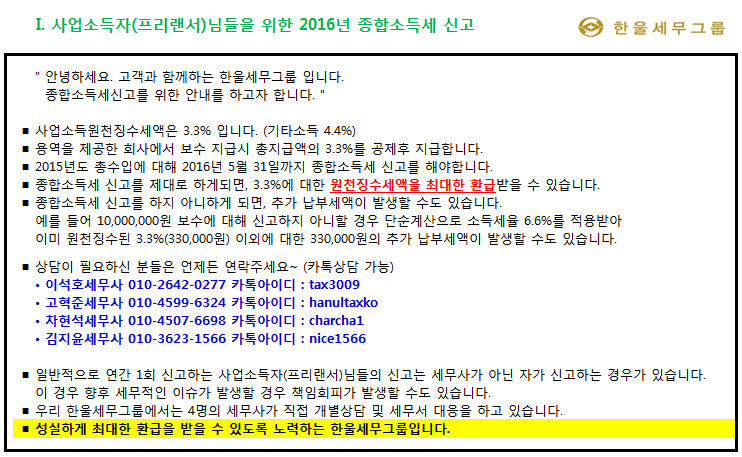 ★프리랜서(사업소득자) 2016년 종합소득세 준비서류 안내★