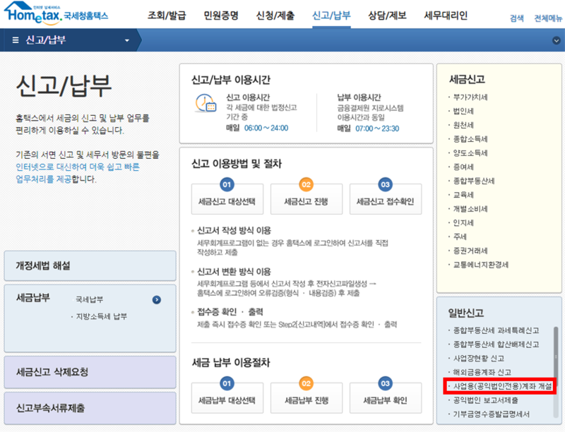 ▷ 홈텍스에서 신고/납부 → 일반신고 → 사업용계좌신고