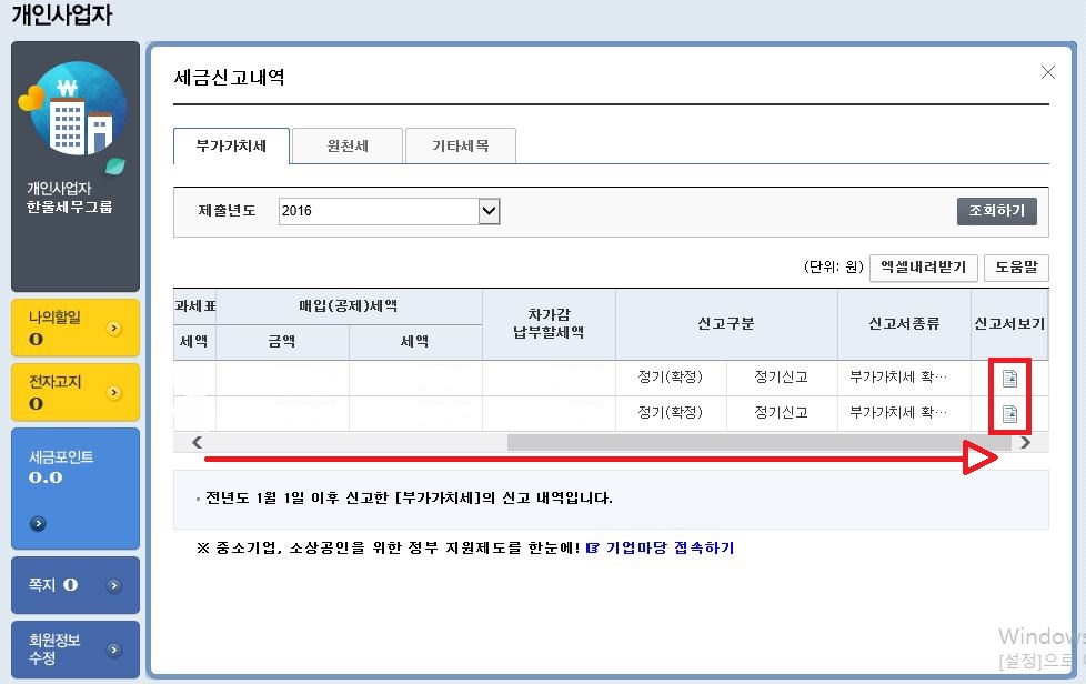 스크롤을 오른쪽으로 쭉 당기셔서 오른쪽 끝에 [신고서보기]의 아이콘을 선택하면 신고서를 확인 및 출력할 수 있는 팝업창이