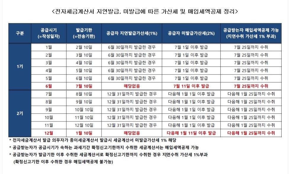* 6, 12월 세금계산서의 경우 지연발급가산세가 없으며, 다음 달 10일까지 발급하지 못한 경우 미발급가산세가 곧바로 적용