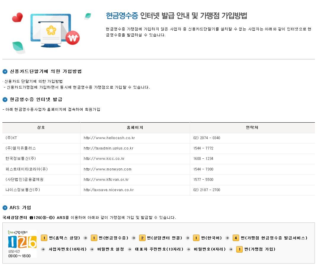 국세상담센터 ☎126(①-①) ARS를 이용하여 아래와 같이 가맹점에 가입 및 발급할 수 있습니다.