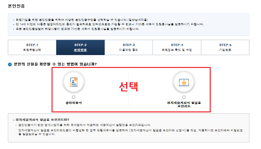 공인인증서 또는 전자세금계산서 발급용 보안카드를 이용하여