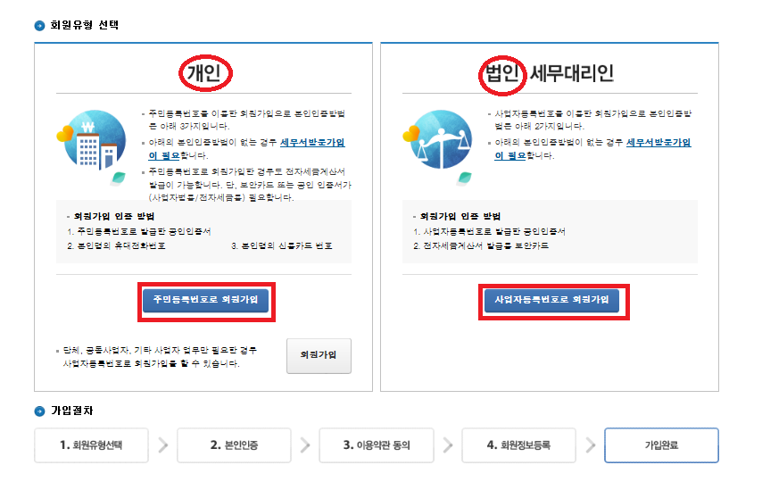 개인 또는 개인사업자는 '개인유형'으로 주민등록번호로 회원가입을 하고요